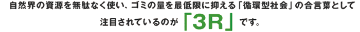 - 「3R」とはReduce(ゴミを減らす)、Reuse(再使用する)、Recycle(再利用する)の頭文字。